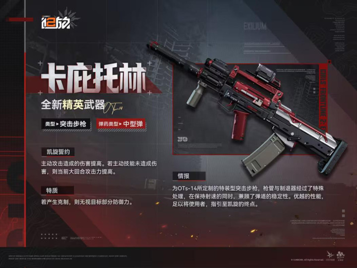 黑闪电专属兵器「卡庇托林」能提高OTS-14自己的伤害。若主动妙技不形成伤害,也能进步其缺点力;而被迫殊效在形成克制伤害时无视敌方留神力,完好适配OTS-14的主要特质。