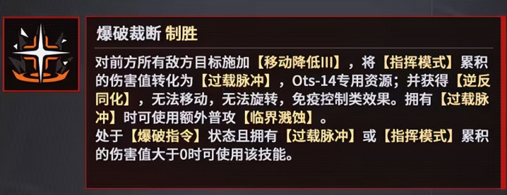 通过开释制胜妙技【爆破裁断】,OTS-14梗概缩短前方通盘敌东谈主的迁徙速率,并凭证先前斗殴累计的伤害获取【过载脉冲】着力,从而进行终点普攻并强化自己普攻伤害。同期,自己获取免控着力,亚搏app官方网站但代价是无法迁徙或转向。需要注目的是,OTS-14需将自己景况切换为【爆破指示】,并在领有累计伤害或【过载脉冲】着力时才能开释大招。