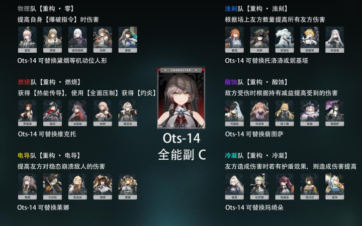 在配队方面,收货于OTS-14具备克制全属性敌东谈主的才能,以及梗概凭证小队成员属性切换更适配该属性作战的被迫妙技,OTS-14不错加入任何一支军队,服务面极广。是组建军队时补位的优选。