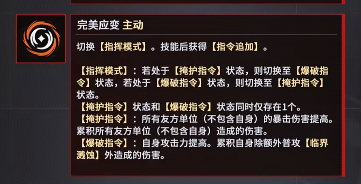 Ots-14具有两个主要景况,分为【爆破指示】(加多自己缺点力,累计自己除终点普攻除外的伤害)和【掩护指示】(加多除我方外小队成员的暴击率,累计小队成员伤害)。不错通过开释妙技【完好应变】切换两种指示以适配不同作战情况。