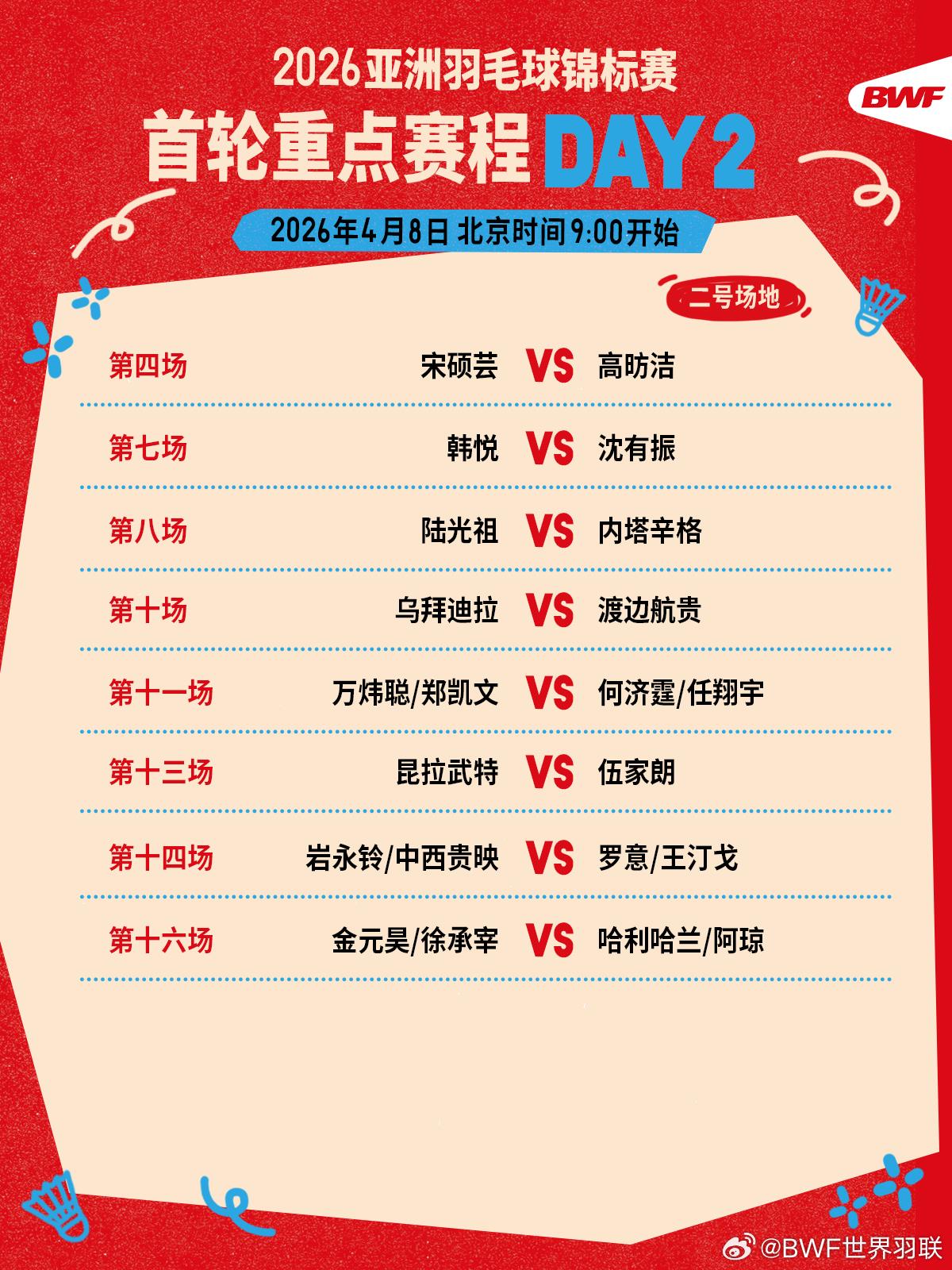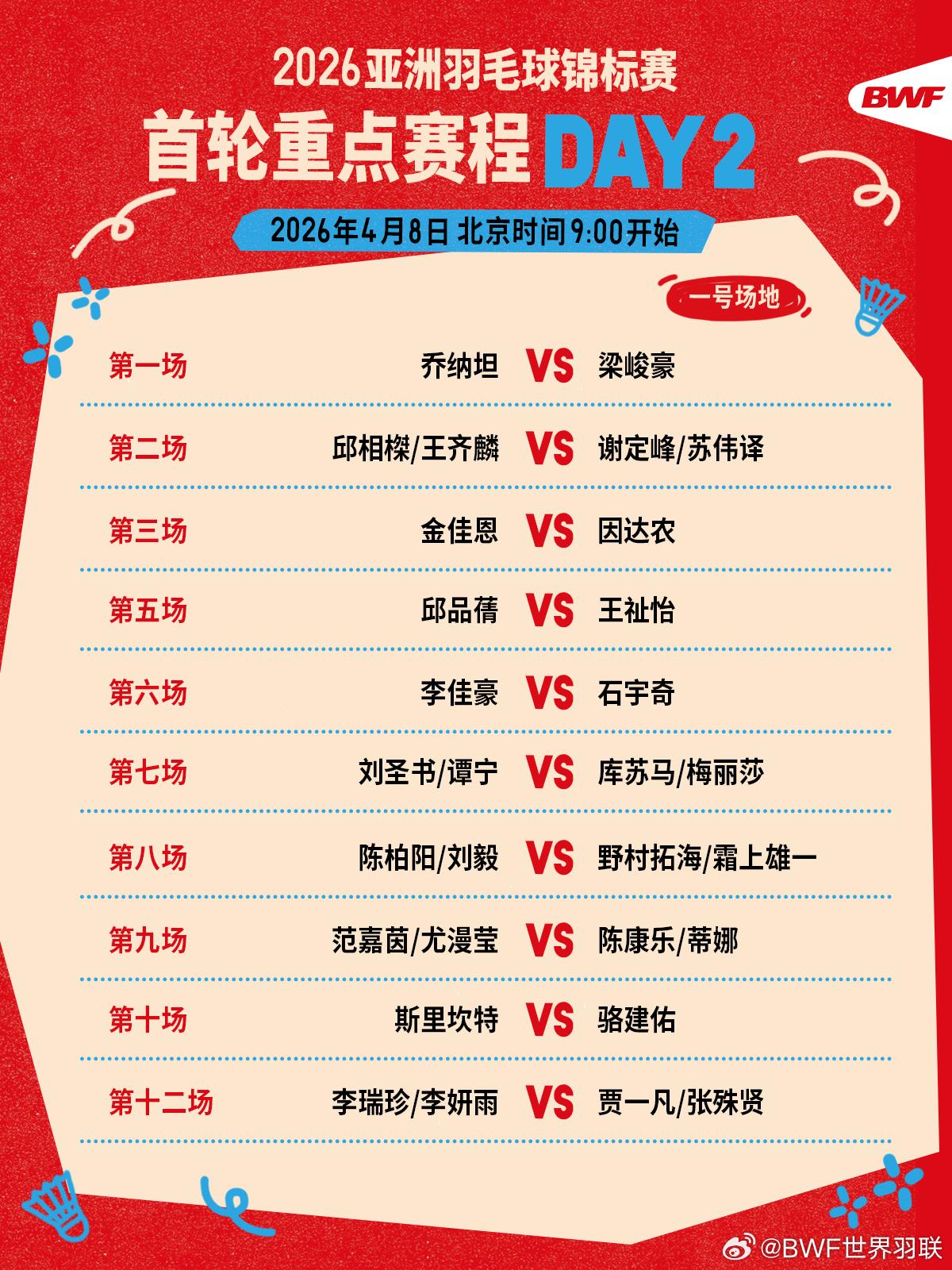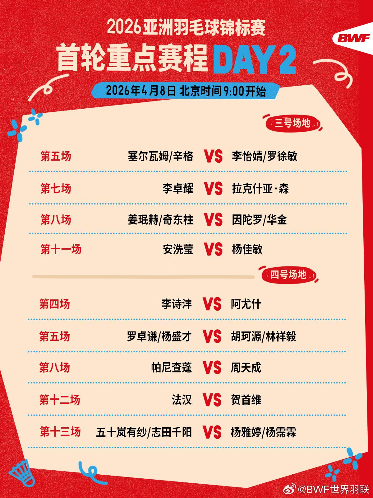 今天(8日),亚博体育2026年亚洲羽毛球锦标赛不绝于北京时辰9时开打。焦点战:石宇奇vs李佳豪、李诗沣vs阿尤什、刘圣书/谭宁vs库苏马/梅丽莎、何济霆/任翔宇vs万炜聪/郑凯文等 。