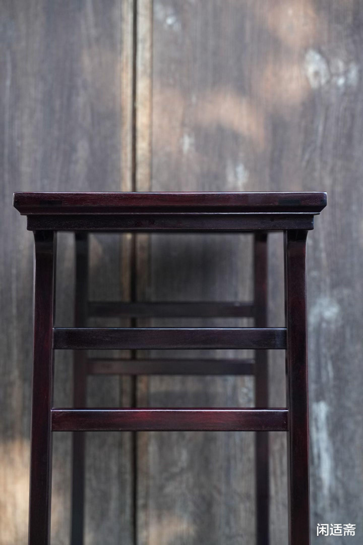 一炷香平头案的极简形制,工艺上苦守明式榫卯古法,贪图空灵,冰盘上部直平然后急速向内削成干净利落斜面。牙条特窄,由机敏有劲直线转微弧形与腿足相交,修长腿足中央起一炷香线,由大地直贯桌面,分外瞩目,举座显得格高神秀,英俊空灵。