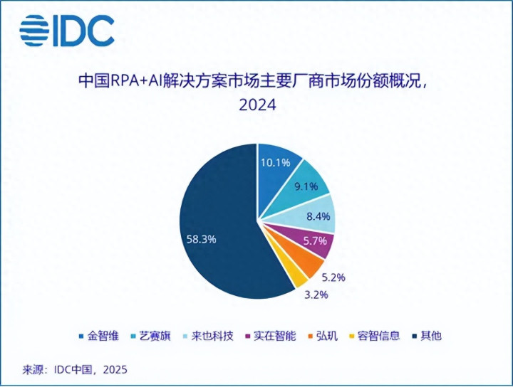 但要是你不雅察2024—2025年的阛阓数据,会发现情况并莫得朝着“替代”发展。凭证 IDC 这几年发布的《中国RPA+AI处理决策阛阓份额》论说,中国RPA+AI阛阓依然保握高增长,且头部厂商的份额正在聚积。阛阓范围在2025年浮松150亿元,年复合增长率跨越35%。