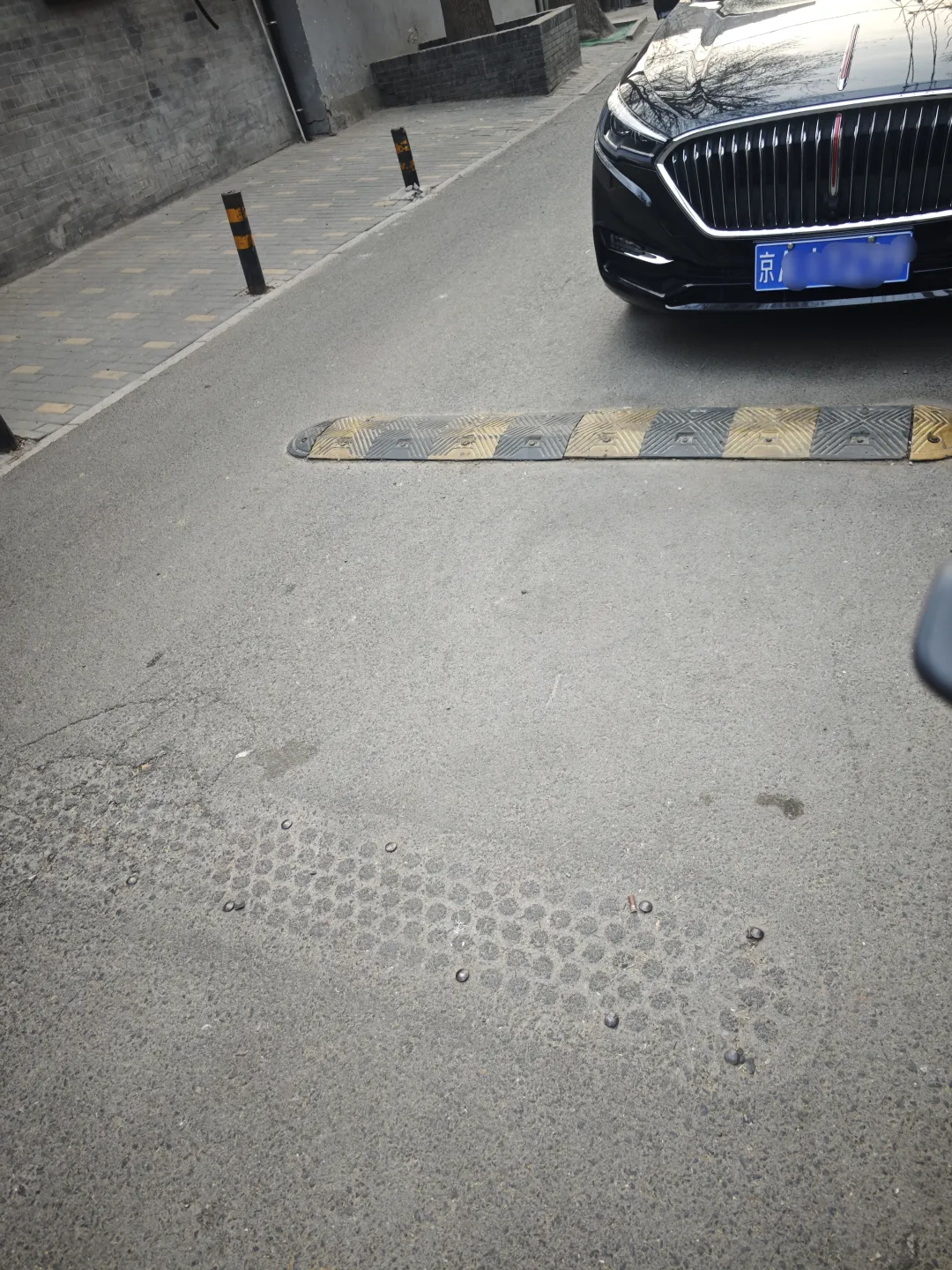 在苏州巷子一栋住户楼旁,路面上有减慢带拆除后留传的钉子。