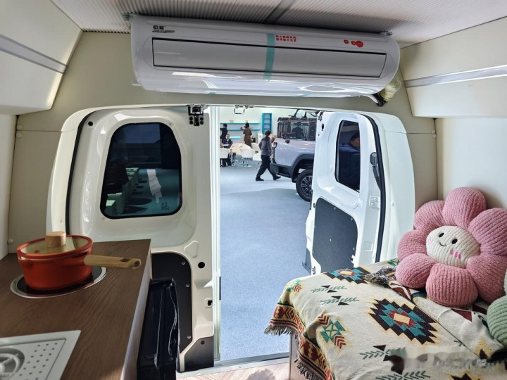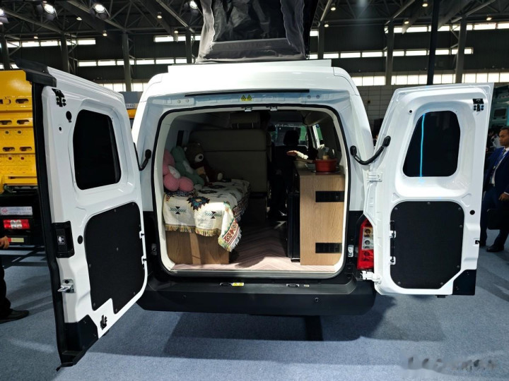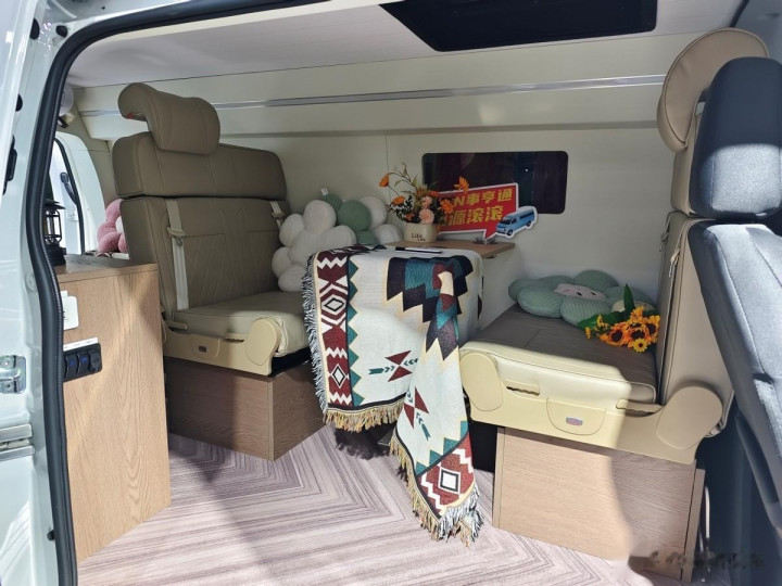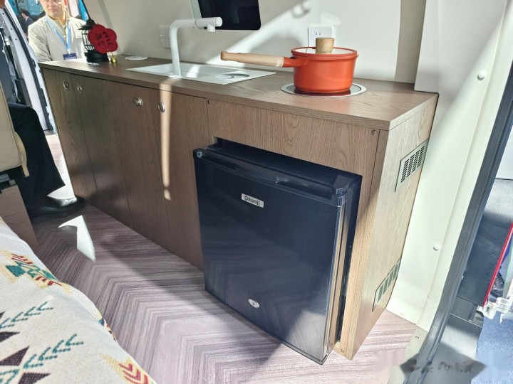车体右侧中部设有一个侧拉门,通过车里不错参加车辆的生存区。生存区选拔米色内饰,神色柔软好意思不雅。生存区设有2排共4个座椅,生存区座椅选拔濒临面布局,中间设有桌子,可供车上东说念主员休息和就餐。车内左后方设有一张沙发,沙发下方有取暖措施。车内右后方设有储物柜、开关面板、水槽、电磁炉、AC 220V插座、50L雪柜,麻雀虽小五脏俱全。