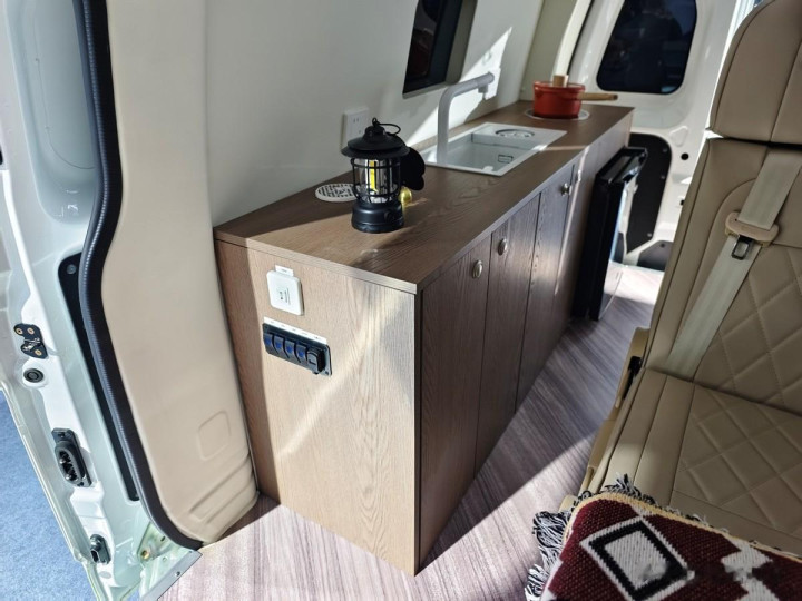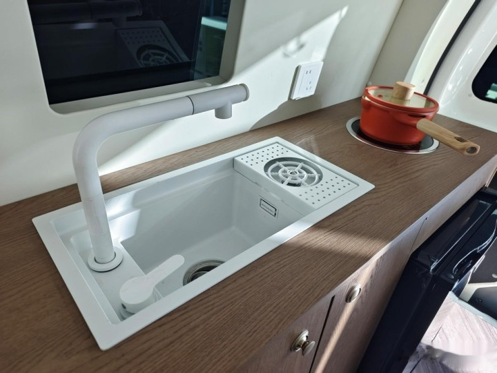 车内右侧的水槽和电磁炉,宿营的时辰不错在这里进行简便的烹调。